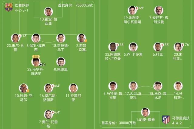 弗里克派上费兰-托雷斯,亚马尔、费尔明和拉菲尼亚组成进攻群,西蒙尼派出阿尔瓦雷斯和格列兹曼双前锋。