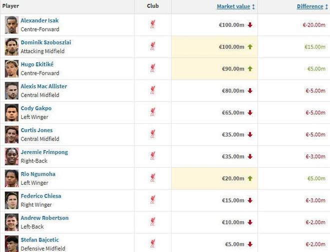 利物浦球员身价变更: